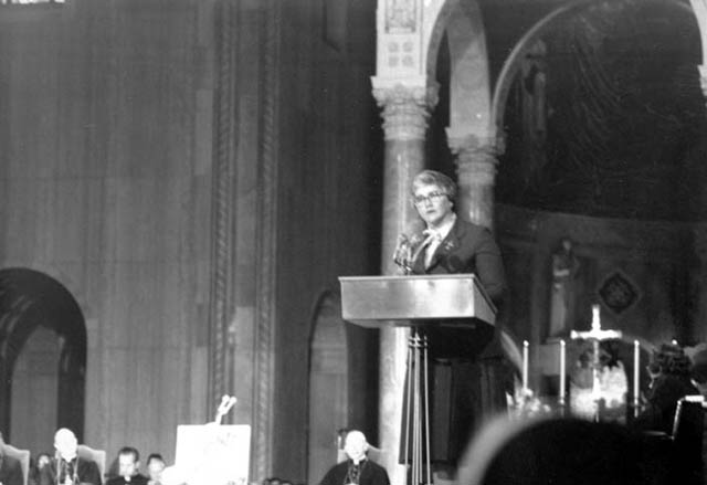 Jusqu’à ce voyage aux USA, Jean Paul II n’a pas fait de faux pas. Les voyages du nouveau pape s’enchaînent avec succès : au Mexique, les évêques acquis à la théologie de la libération ne l’ont pas fait trébuché ; en Pologne, il a commencé à soulever le joug de la domination soviétique ; et voilà que les États-Unis l’accueillent avec enthousiasme. Mais aux derniers jours de son périple triomphant, dans la basilique de l’Immaculée Conception de Washington, pour la première fois, quelqu’un se dresse sur son chemin. C’est sœur Teresa Kane, supérieure des Sœurs de la Pitié. Elle s’exprime alors en tant que présidente de la Conférence générale des religieuses américaines : « les religieuses des États Unis ont répondu de manière obéissante aux efforts de renouveau réclamés par l’appel de Vatican II ». Mais, en conséquence de ce renouvellement, la religieuse n’ose rien moins que de demander « d’inclure les femmes en tant que personnes dans tous les ministères de l’Église ». L’atmosphère est glaciale et le pape, qui ne desserre pas la mâchoire, élude la proposition et répond en rappelant l’importance du costume religieux…